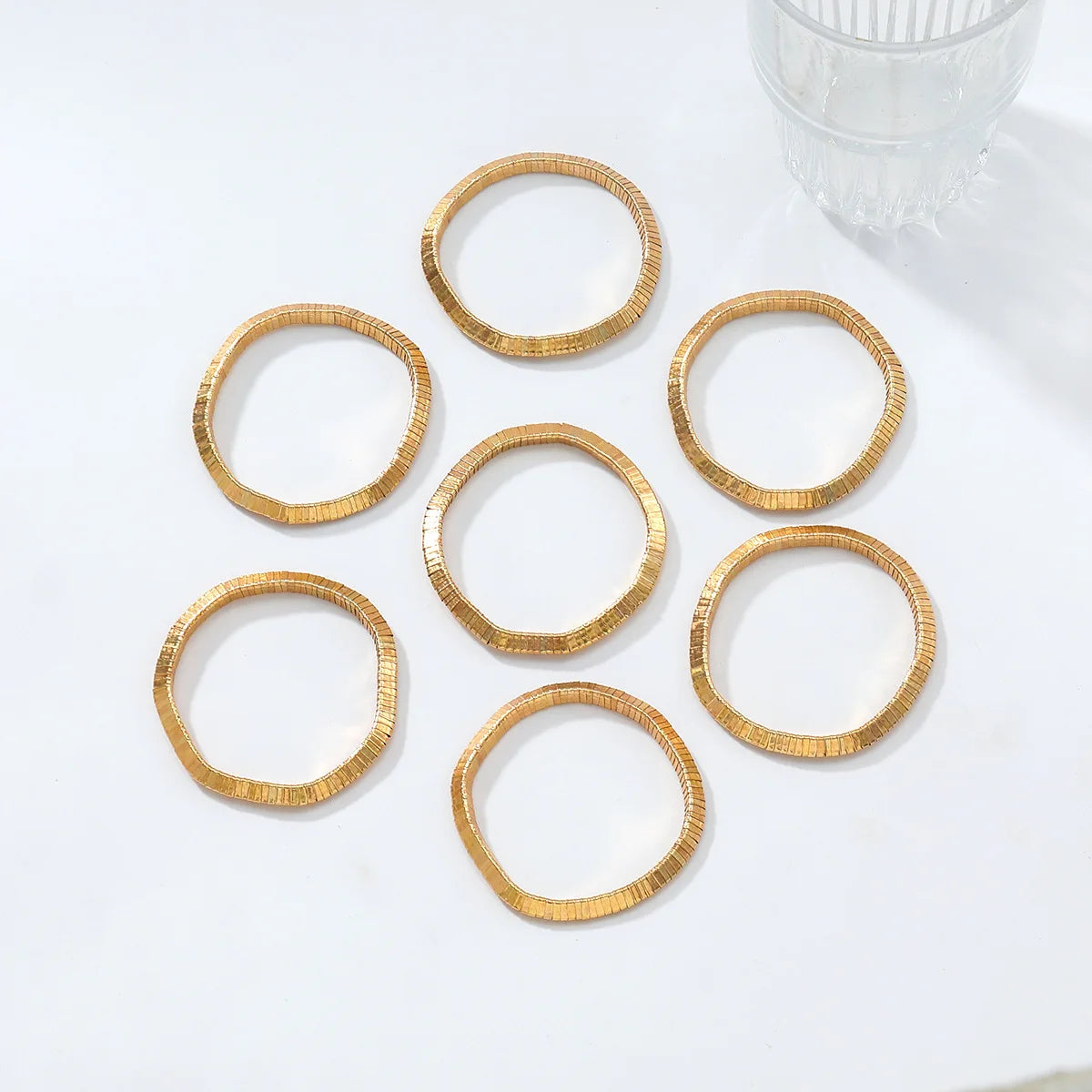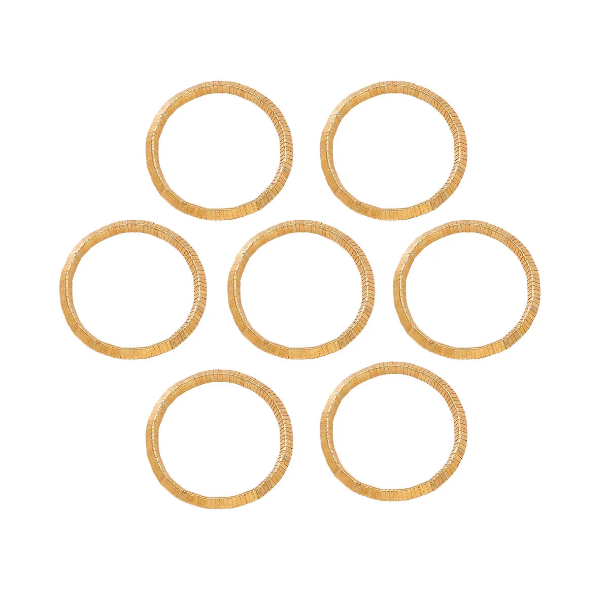 Layers of gold-toned bands interwoven with textured detail wrap the wrist in shimmery summer style, their stacked form catching light with every move for a look that feels equal parts carefree and unforgettable.