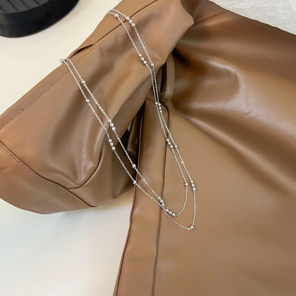 Two slender chains fall in harmony, their beaded accents glinting like scattered stars. Available in radiant gold or luminous silver, each piece is crafted from stainless steel for lasting shine and daily wear.