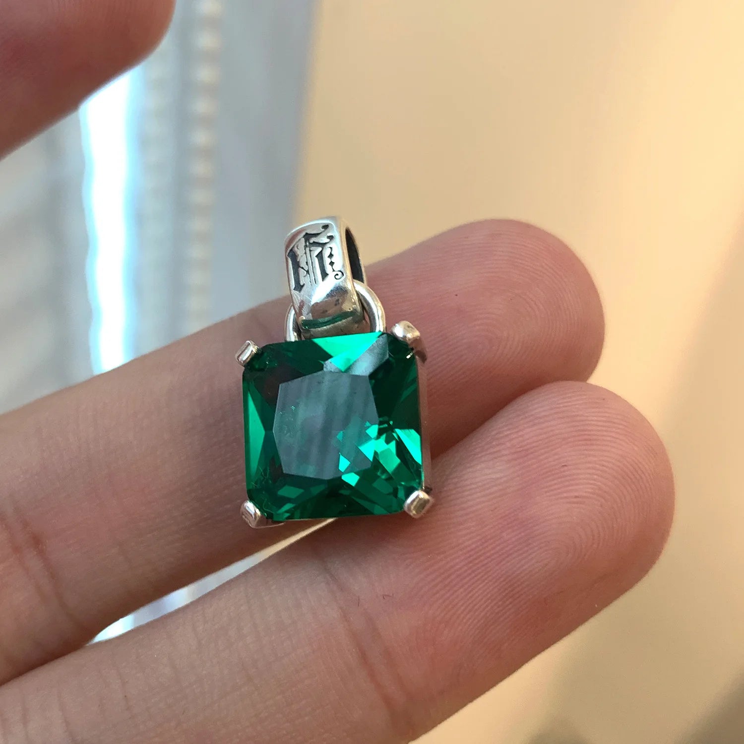- Square-cut green crystal centerpiece