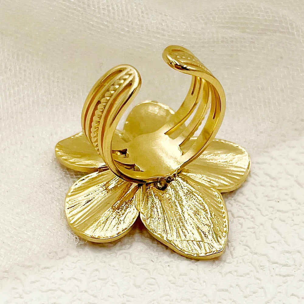 This eye-catching set radiates from every angle, pairing sculpted floral studs and a matching ring, each flower cast in ridged steel that shifts with light like petals frozen in bloom.
