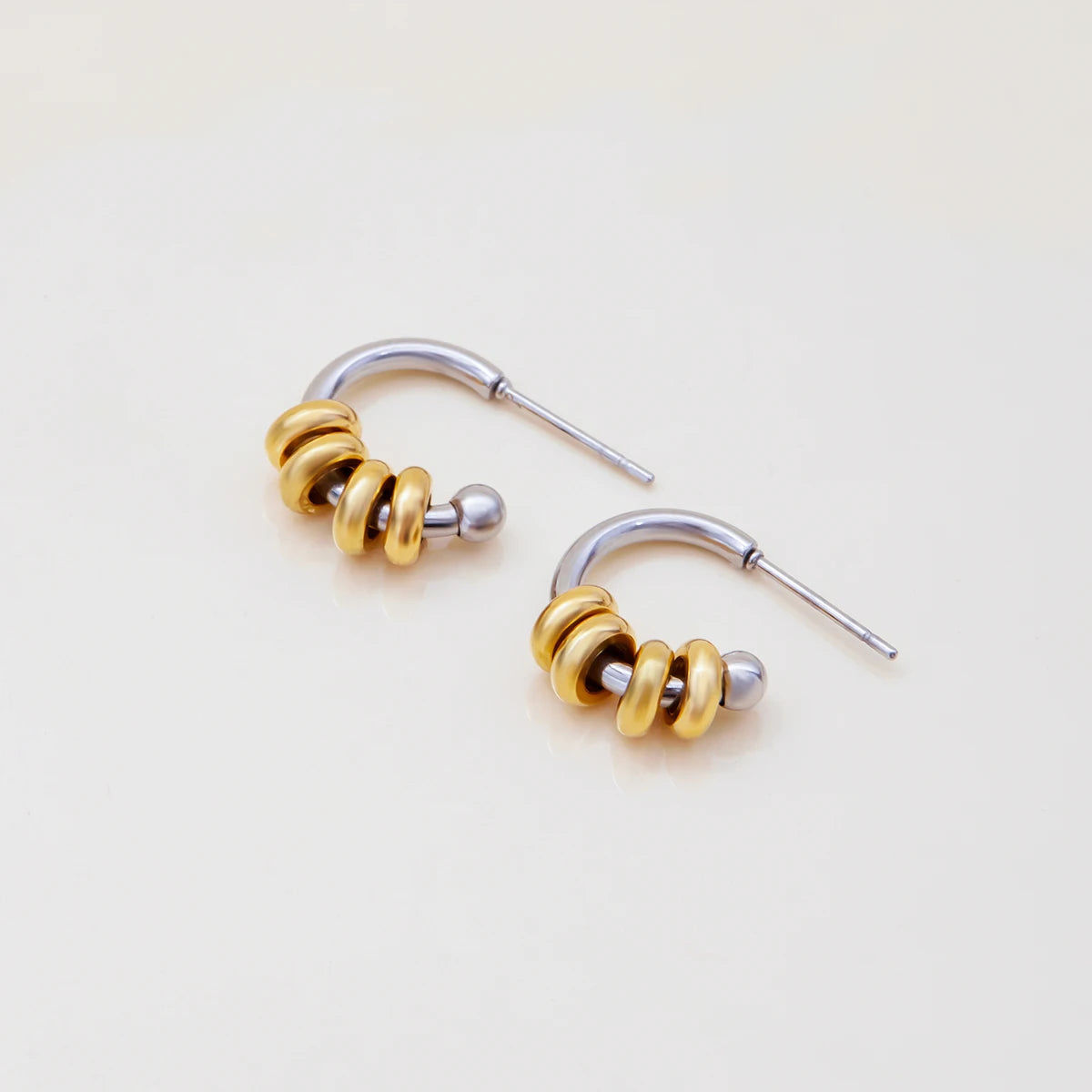 Two tones, one continuous hoop, refined through detail. These earrings feature a smooth silver curve accented with stacked gold-toned rings. The layered hoops introduce texture and contrast while keeping the form close to the ear for a clean, balanced profile. One of our favorites for their ease of layering while holding their own in everyday wear.