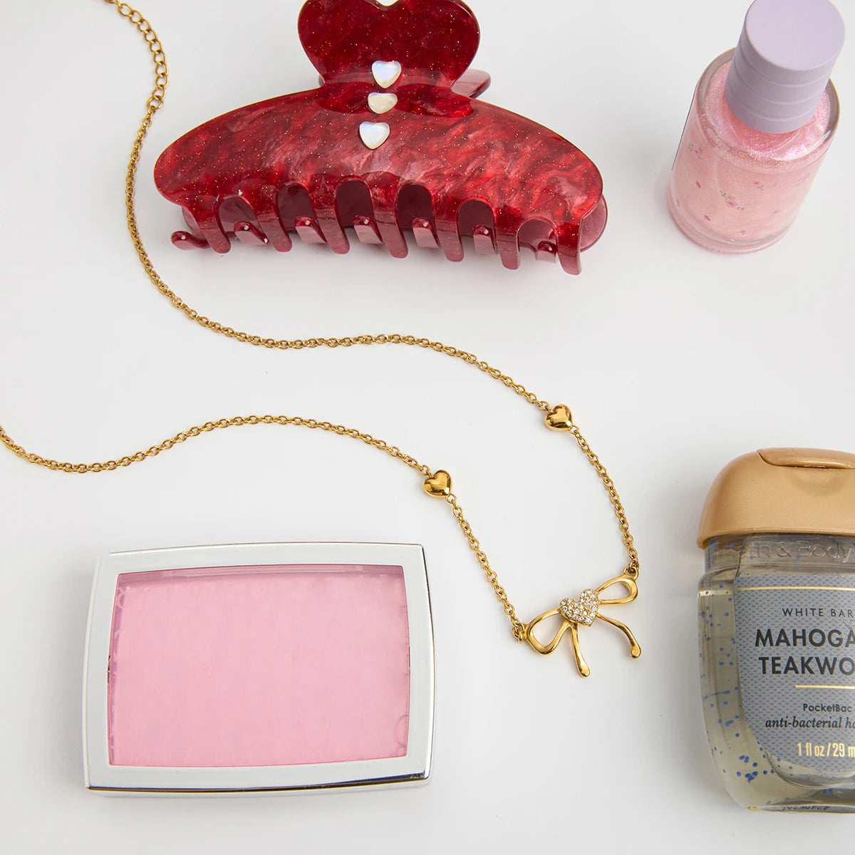 Designed as a fine-chain necklace with fixed bow and heart pendants that rest flat at the neckline for comfortable daily wear.