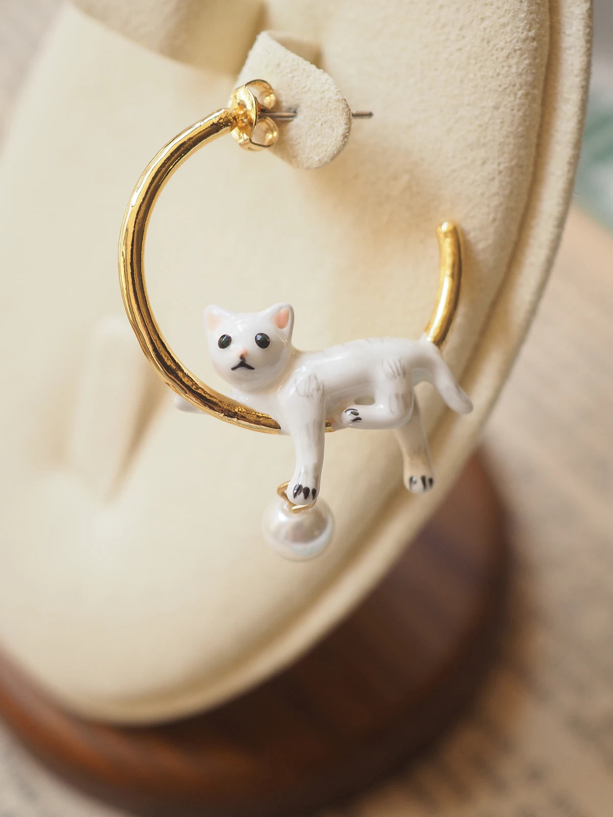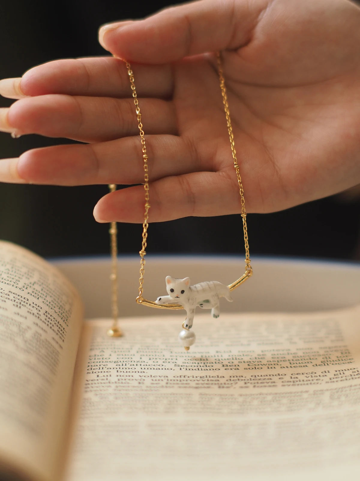 There’s something irresistible about the way this tiny cat seems caught mid-adventure, perched on a golden arc with a pearl playfully in tow. Each piece is hand-detailed to capture that mix of curiosity and charm, giving the earrings and necklace a sculptural, story-like presence. Wear them as a set or on their own.