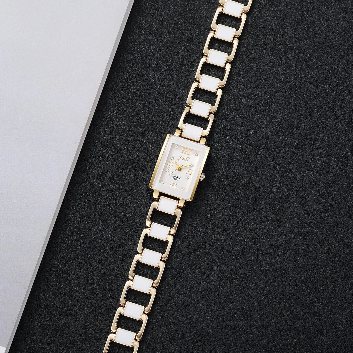 Cradled within its gilded square case, the clean white dial shimmers with crystal markers and gold numerals, perfectly coupled with the art deco precision of its enamel-inlaid steel bracelet.