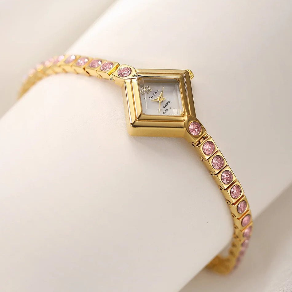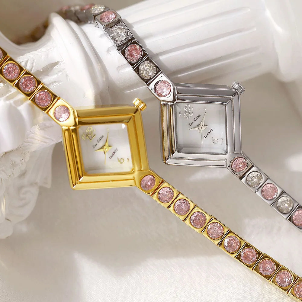 A 26 mm square case framed in Hardlex glass meets rhinestone-set steel links, its quartz-driven dial merging jewelry’s shimmer with the precision of a watch designed for every occasion.